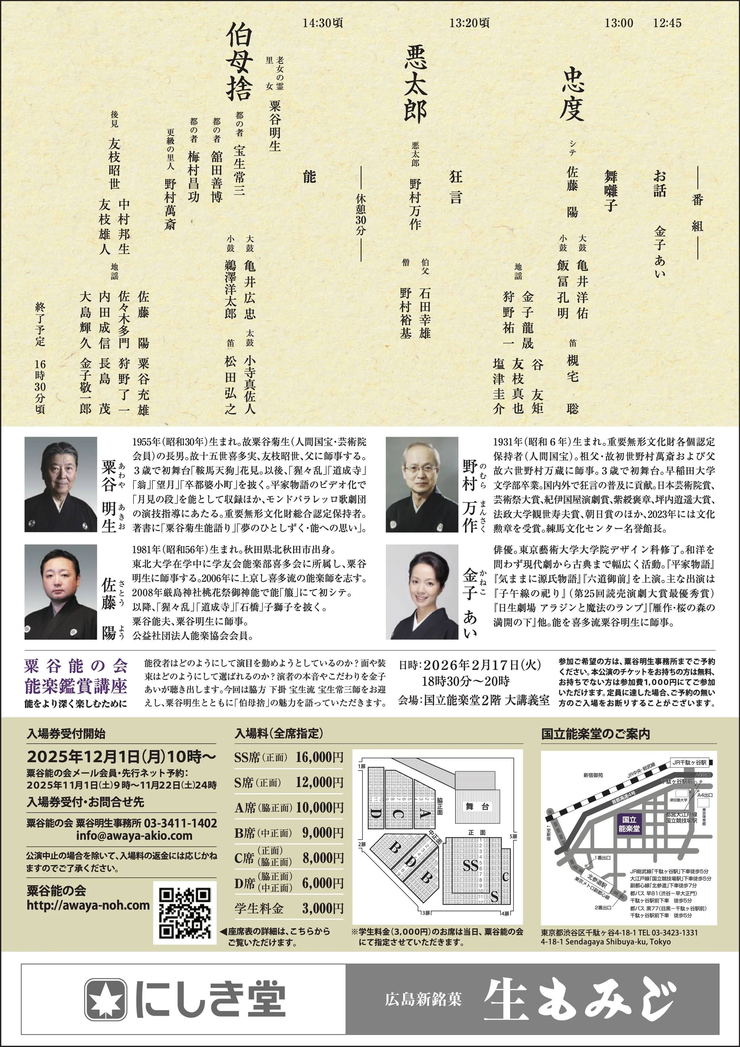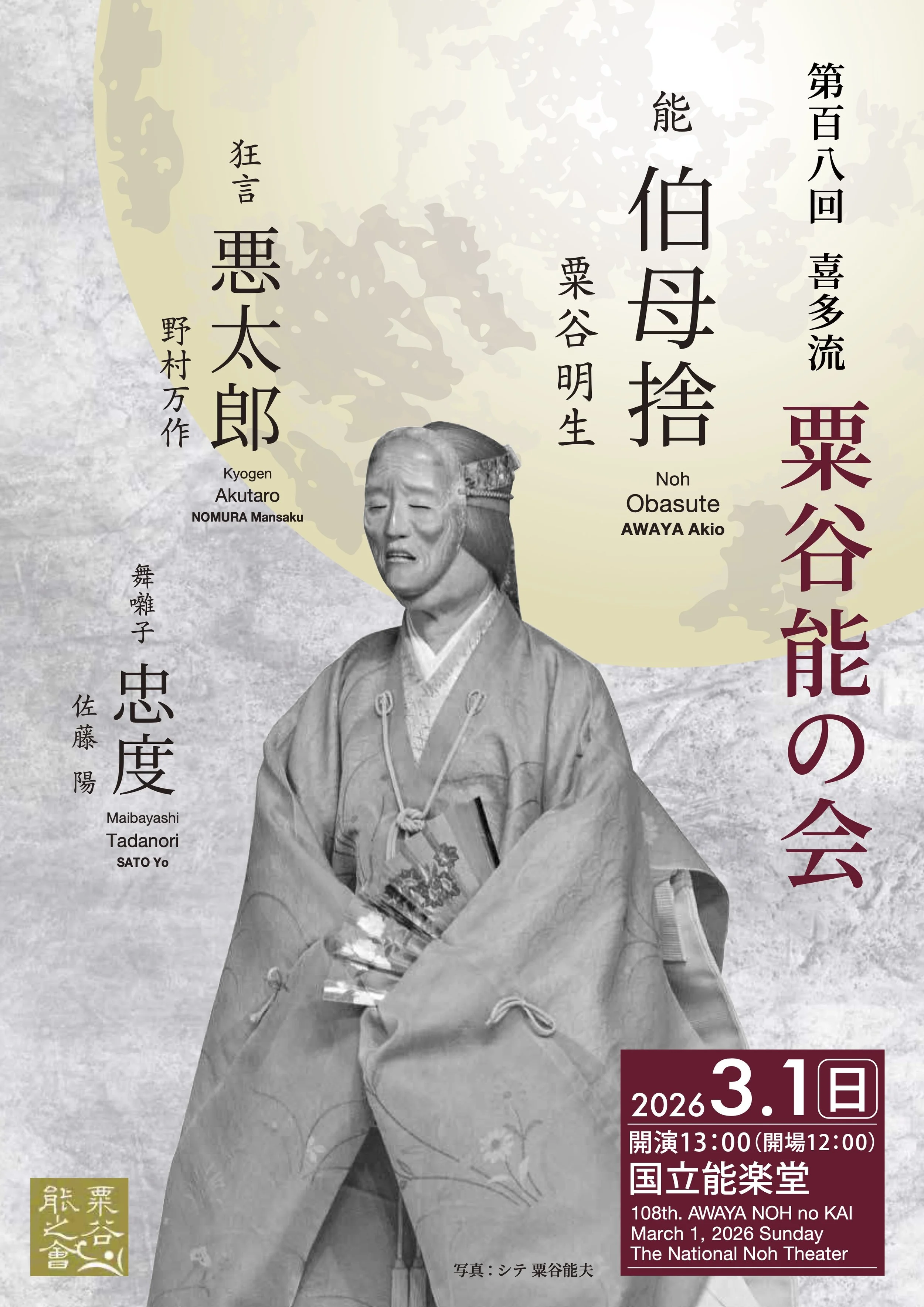 第108回粟谷能の会 Sunday, March 1, 2026 1:00 PM 4:30 PM 13:00 16:30 Google Calendar ICS 能「伯母捨」粟谷明生舞囃子「忠度」佐藤陽