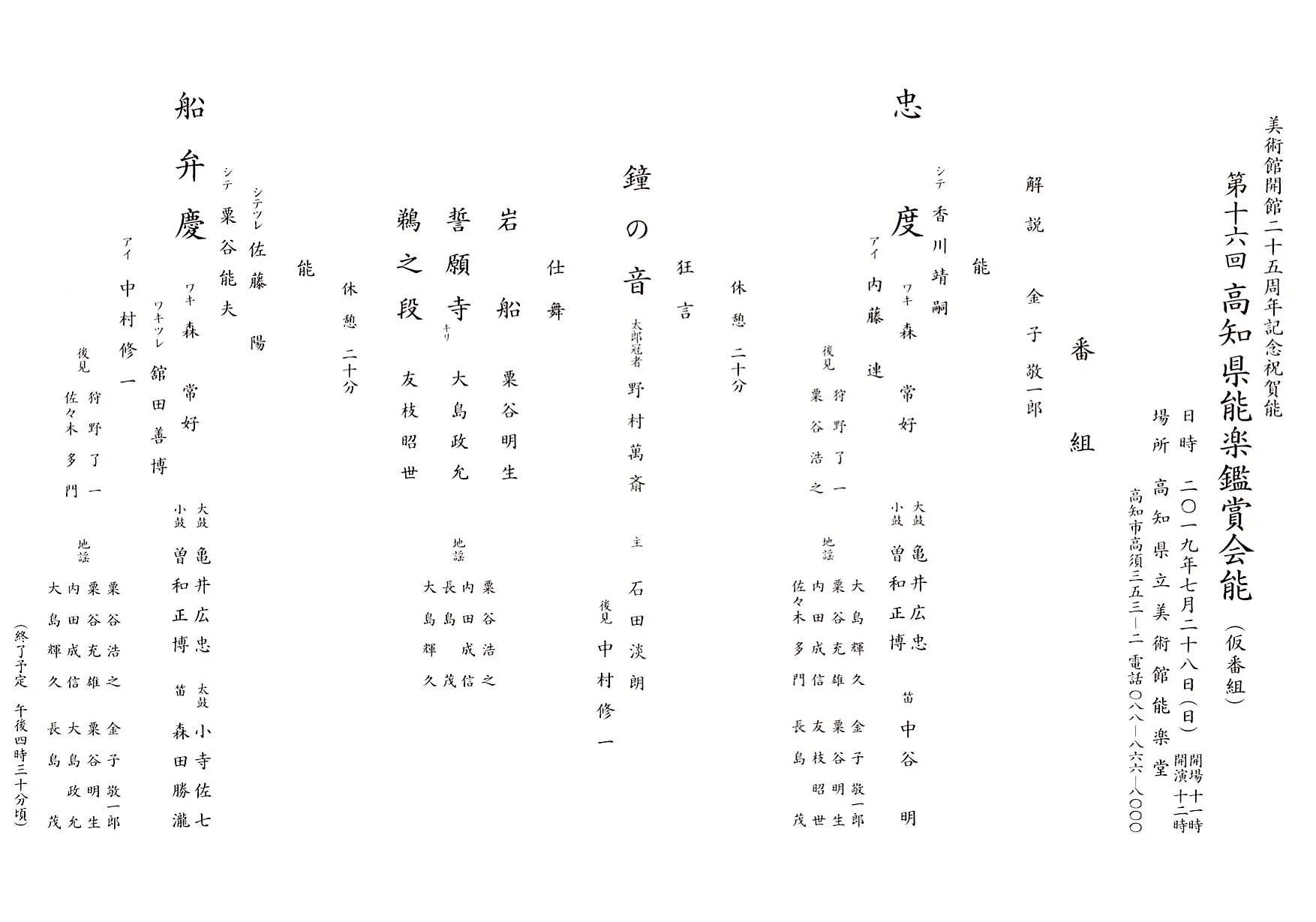 高知能楽鑑賞会 Sunday, July 28, 2019 12:30 PM 12:30 PM 12:30 12:30 高知県立美術館 (map) Google Calendar ICS 「船弁慶」粟谷能夫