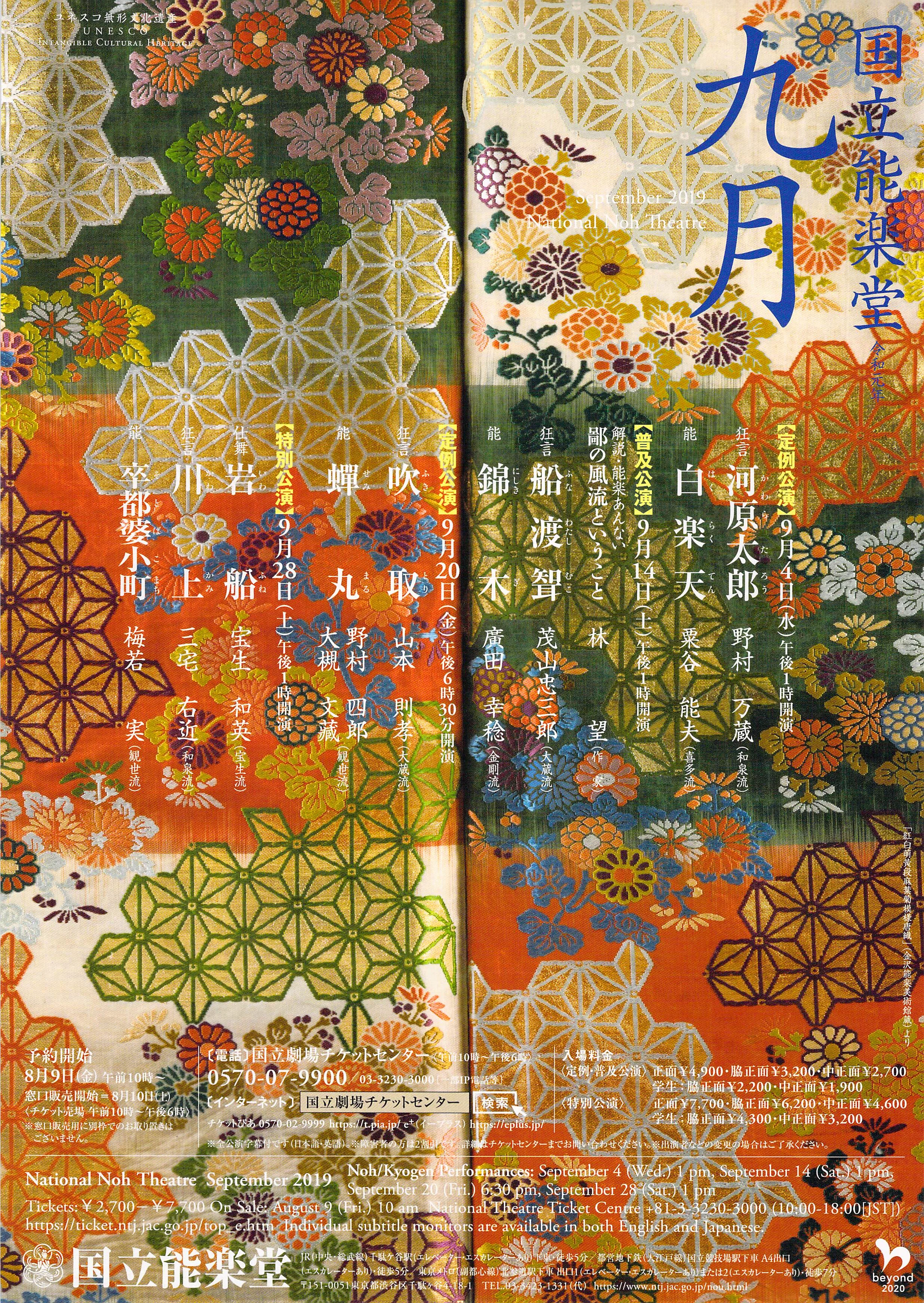 国立能楽堂定例公演 Wednesday, September 4, 2019 1:00 PM 1:00 PM 13:00 13:00 国立能楽堂 (map) Google Calendar ICS 「白楽天」粟谷能夫